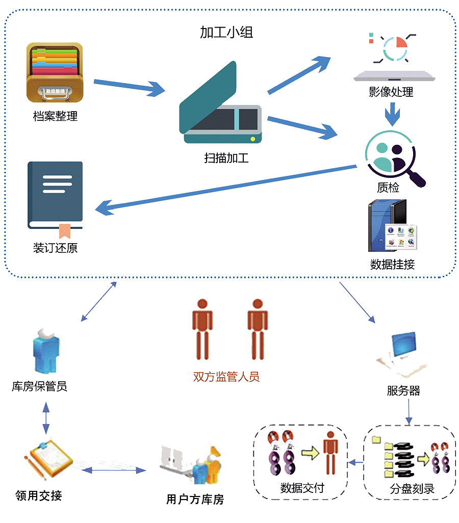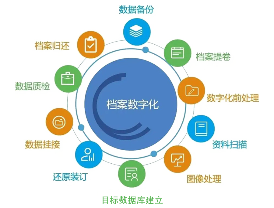 档案数字化的基本流程包括扫描、处理、质检、数据挂接、还原入库等。